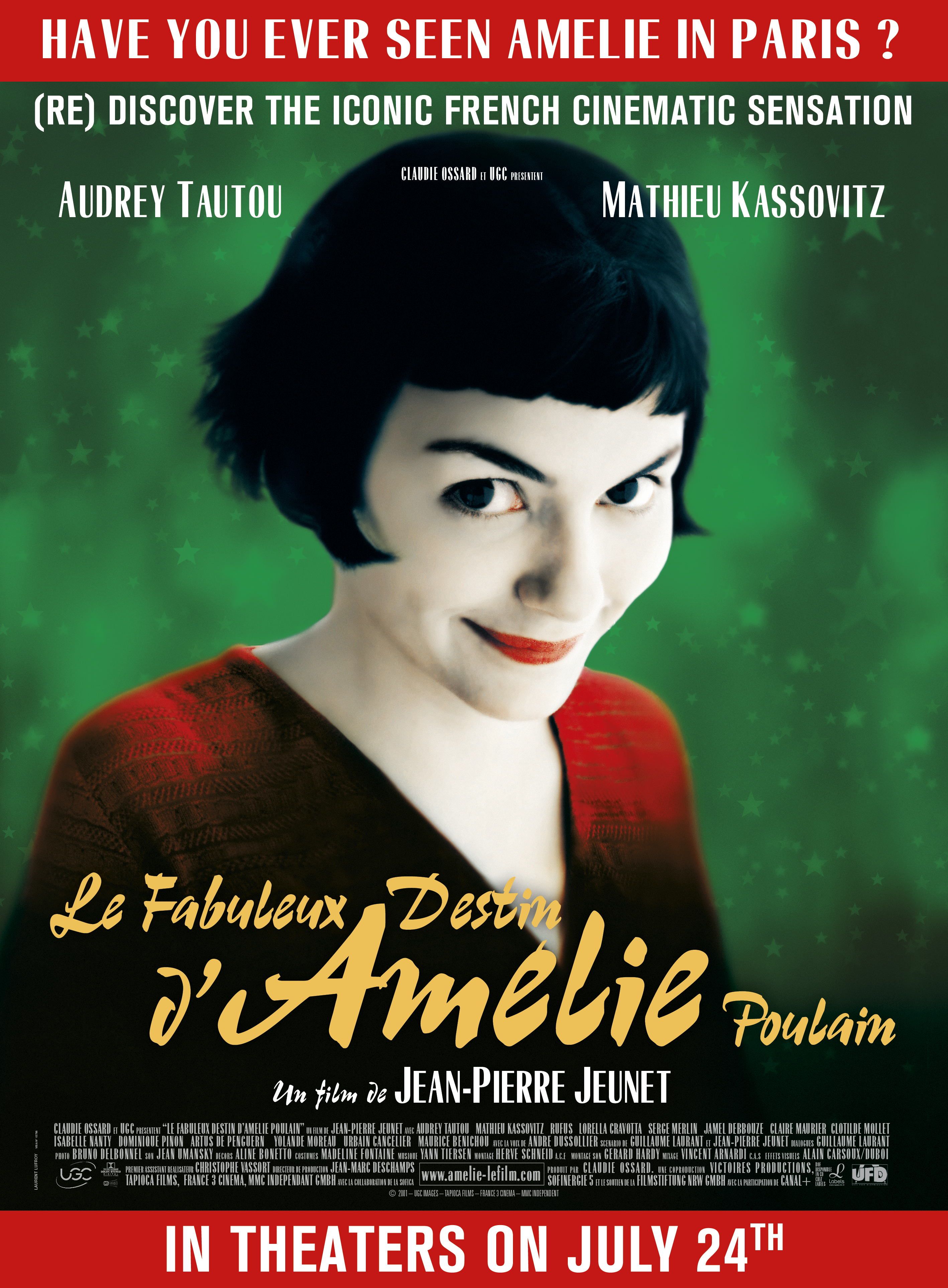 Avec : Audrey Tautou, Mathieu Kassovitz, Isabelle Nanty, Jamel Debbouze, Yolande Moreau, André Dussolier, Dominique Pinon, Rufus, Ticky Holgado